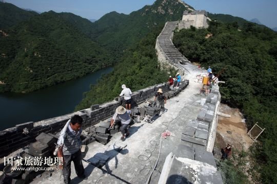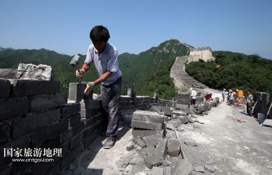 國家旅游地理 北京8月5日訊 8月4日下午,施工人員在北京懷柔西水峪古長城進行修繕。西水峪古長城始建于明代,此次修繕部分總長960米,在嚴格保障結(jié)構(gòu)安全以及原有風貌的前提下進行恢復(fù)性修繕,修繕后將達到對游客開放攀登的標準。預(yù)計修繕工程將于今年10月底完成,屆時經(jīng)過專業(yè)部門驗收后有望對外開放。 /新華社發(fā)(卜向東 攝)