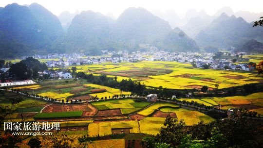 金秋時節(jié),貴州省興義市山鄉(xiāng)里金黃的稻田與民居交相輝映,秋景如畫。