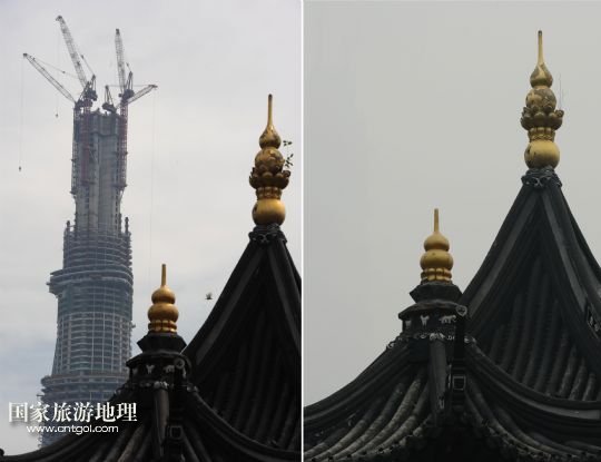 國家旅游地理 上海12月26日訊 這張拼版照片顯示的是:2013年8月3日在上海豫園拍攝的在建中的上海中心(左圖);12月26日在同一地點拍攝的上海中心“消失”在霧霾中(右圖)。當日,上海遭遇霧霾天氣,空氣重度污染。 /新華社發(fā)(賴鑫琳 攝)
