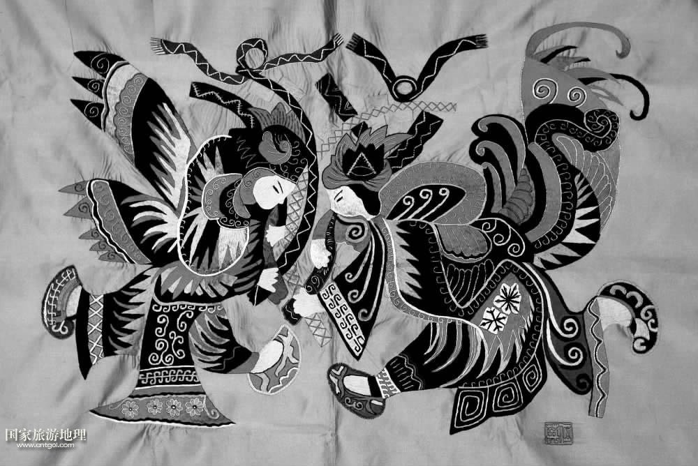 苗族沒有文字 ,只有語言 ,但他們將信仰圖騰和歷史傳說都融在了繁復(fù)的圖案中間。自古以來 ,苗繡作為苗族文化傳承的載體 ,兼有文字和圖像的功能。由于苗族人至今沒有形成可通讀的文字 ,苗家人文化歷史的傳承 ,主要依靠口口相傳的口頭文學(xué)以及他們的衣裝和衣裝上的刺繡。