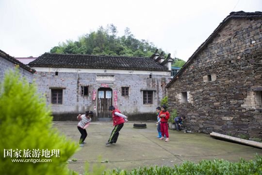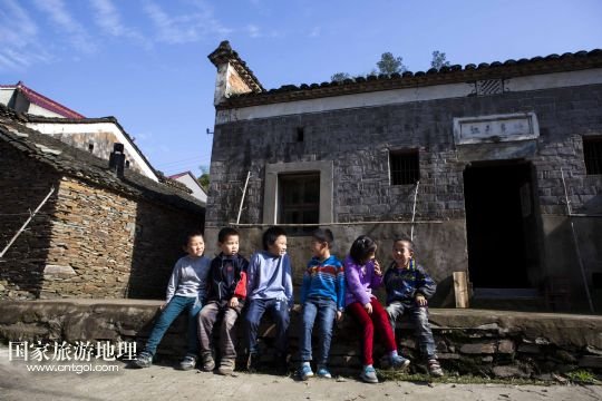 國家旅游地理 江西九江5月12日訊 5月12日,孩子們坐在土目源村的老房子前玩耍。空幽的山谷,不息的溪流,斑駁的石墻,古樸的石屋。在江西省北部山區(qū),有一座石屋山居的古村落——都昌縣大港鎮(zhèn)土目源村。