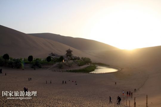 國家旅游地理 甘肅酒泉5月19日訊 夕陽下的甘肅省敦煌市鳴沙山月牙泉顯得更加迷人(5月18日攝)。初夏時(shí)節(jié),甘肅省敦煌市鳴沙山月牙泉景區(qū)風(fēng)光秀美,吸引眾多中外游客前來觀光游覽。 新華社發(fā)(張曉亮 攝)