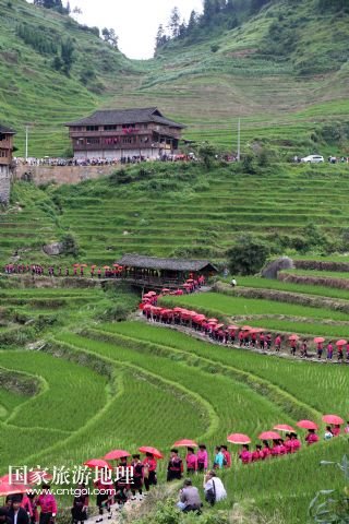 每年農(nóng)歷五月十四日、十五日是廣西桂林龍勝各族自治縣泗水鄉(xiāng)潘內(nèi)瑤寨紅瑤同胞與親朋好友聚會的日子,亦稱當(dāng)?shù)噩幷?ldquo;紅衣節(jié)”。紅瑤同胞相約在這期間開展唱瑤歌、評寨花、傳統(tǒng)刺繡、打旗公等傳統(tǒng)特色活動。紅瑤是瑤族的一個支系,因喜穿紅色衣服而得名。 /新華社發(fā)(石農(nóng)兵 攝)