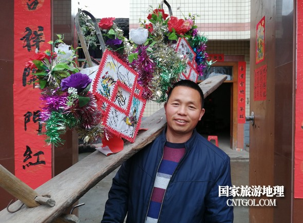 中年村民肩抬慶燈準(zhǔn)備去接“龍”。鄒善水 攝