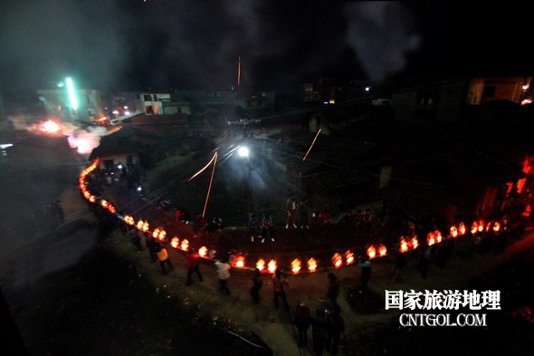 2月18日入夜,春雨霏霏。在光裕堂祖祠祭龍頭畢,鄒姓村民紛紛肩抬慶燈到祖祠接成220多米長(zhǎng)的“龍”身。三聲銃響,游龍時(shí)而在村間慢悠游弋,時(shí)而在村道滯拔狂走,火紅的燭光伴著霏霏春雨,讓慶燈“龍”絢麗多姿,展示了“紙包火”的奇跡。 游“龍”所經(jīng)之處,鞭炮和禮花聲不絕于耳,祈求五谷豐登、吉祥如意。街巷人山人海,熱鬧非凡,一派花燈游龍慶豐收狂歡鬧元宵盛況。 吸引了海內(nèi)外游客及四鄰八鄉(xiāng)的萬余群眾紛紛前往觀看。